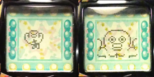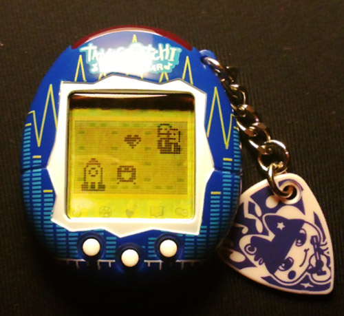 … I only untabbed it to test, which of my other two tamas’ IR connection is broken *cough cough* Must say, that the buttons are a tiny weeny bit unresponsive (yay… games will be so much fun then… /sarcasm), and it somehow feels smaller and lighter than my other tamas, but I guess that’s because the antenna is missing. The clock animation, with a little baby tama eating musical notes is adorable, though :3