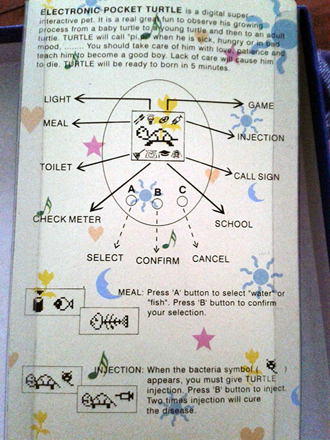 The Pocket Turtle runs pretty much like an original P1 tamagotchi as you can see from the instructions on the back of the package: